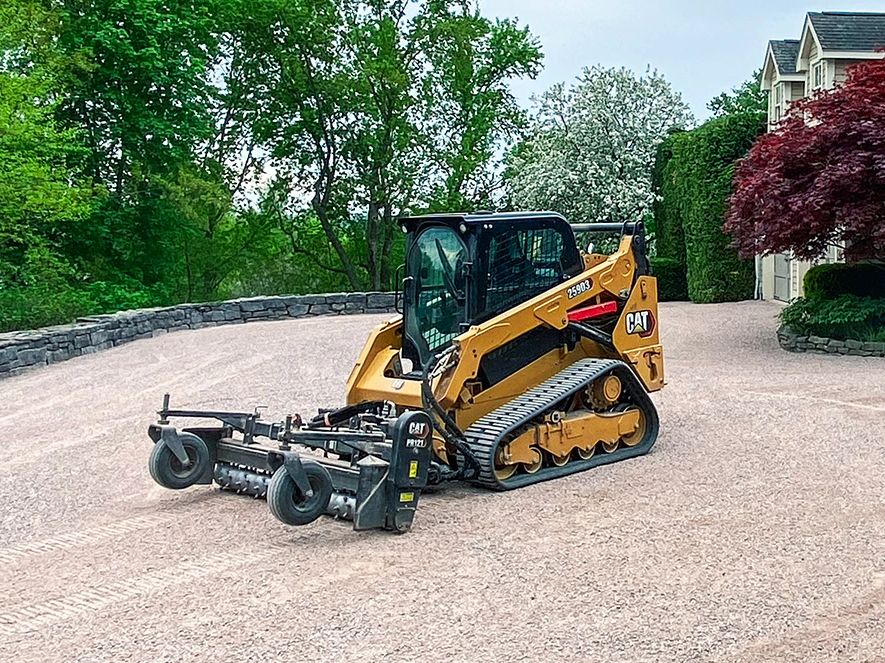 This 74HP tracked skid steer is the perfect driveway grading machine. It combines a CAT "Harley" Power Rake and 2200lb Vibratory Smooth Drum Roller/Compactor.